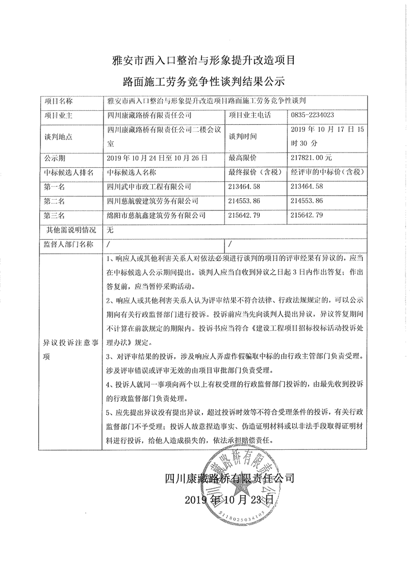 四川康藏路橋有限責任公司雅安市西入口整治與形象提升改造項目路面施工勞務競爭性談判結果公示