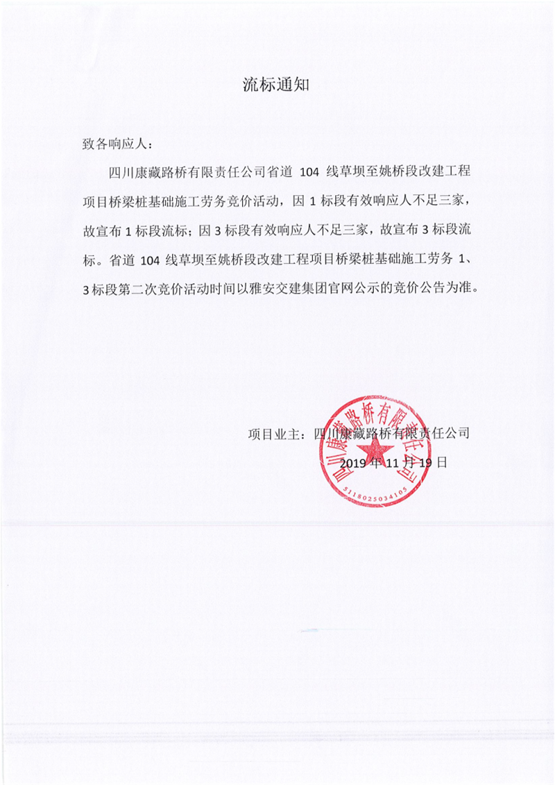 四川康藏路橋有限責(zé)任公司省道104線草壩至姚橋段改建工程項目橋梁樁基礎(chǔ)施工勞務(wù)競價(1標(biāo)段、3標(biāo)段)流標(biāo)通知