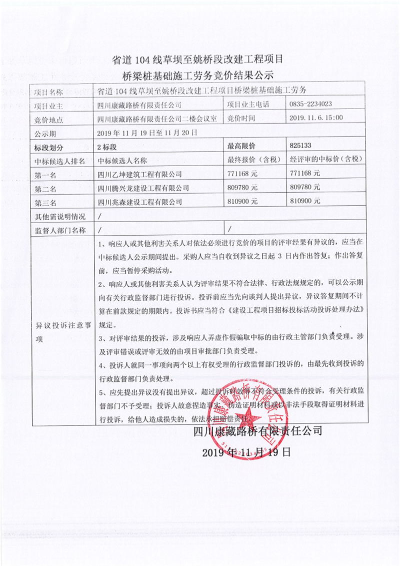 四川康藏路橋有限責任公司省道104線草壩至姚橋段改建工程項目橋梁樁基礎(chǔ)施工勞務競價(2標段)結(jié)果公示