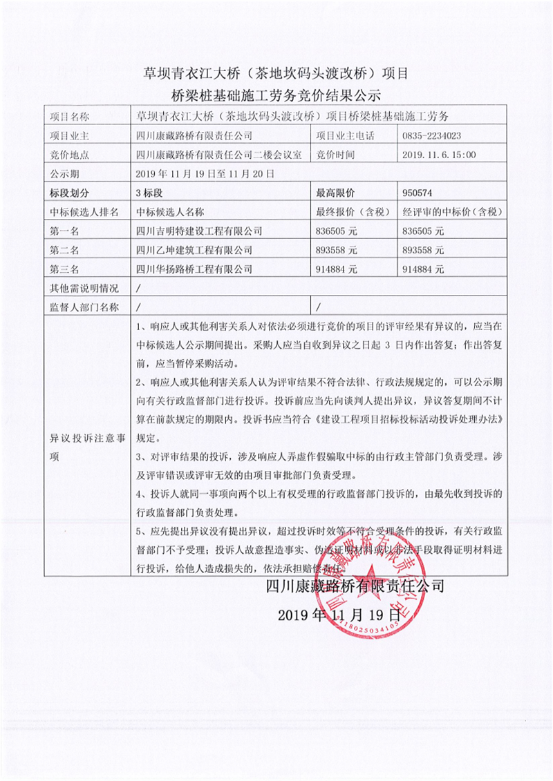 四川康藏路橋有限責(zé)任公司草壩青衣江大橋(茶地坎碼頭渡改橋)項目橋梁樁基礎(chǔ)施工勞務(wù)競價(3標(biāo)段)結(jié)果公示