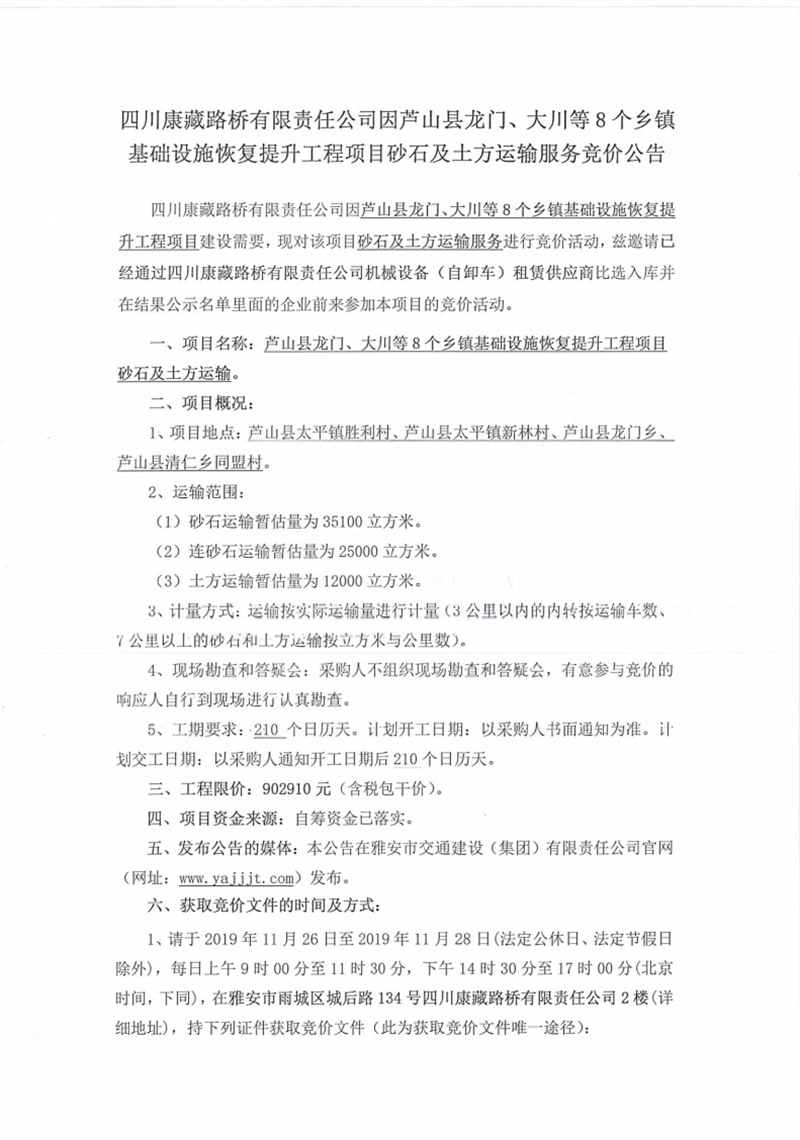 四川康藏路橋有限責任公司蘆山縣龍門、大川等8個鄉(xiāng)鎮(zhèn)基礎(chǔ)設(shè)施恢復(fù)提升工程項目砂石及土方運輸服務(wù)競價公告
