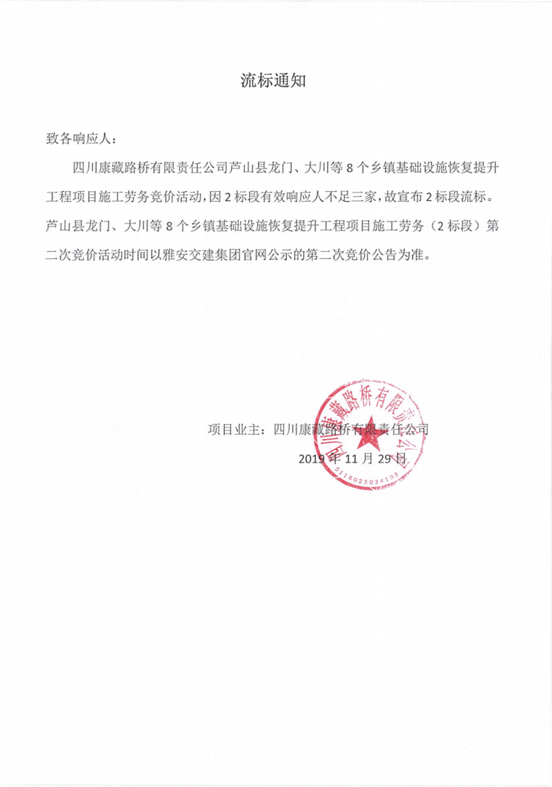 四川康藏路橋有限責任公司蘆山縣龍門、大川等8個鄉(xiāng)鎮(zhèn)基礎設施恢復提升工程項目施工勞務(2標段)競價流標通知