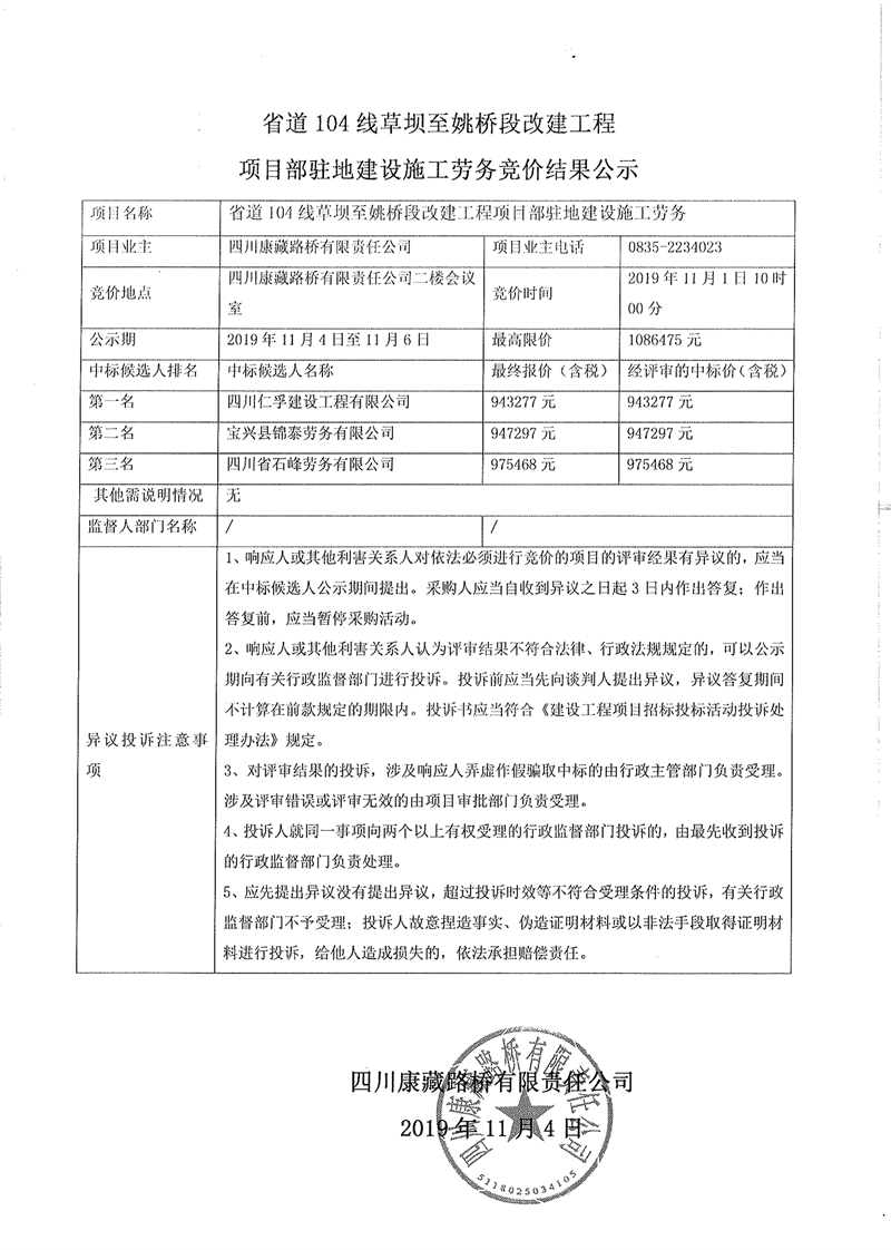 四川康藏路橋有限責(zé)任公司省道104線草壩至姚橋段改建工程項目部駐地建設(shè)施工勞務(wù)競價結(jié)果公示