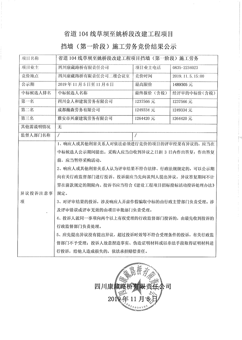 四川康藏路橋有限責(zé)任公司省道104線草壩至姚橋段改建工程項目擋墻(第一階段)施工勞務(wù)競價結(jié)果公示
