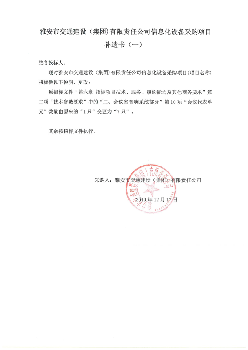 雅安市交通建設(shè)(集團(tuán))有限責(zé)任公司信息化設(shè)備采購項(xiàng)目補(bǔ)遺書(一)