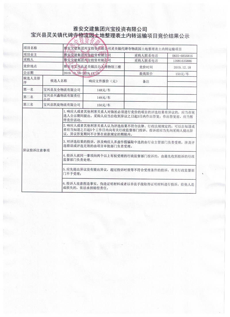 雅安交建集團(tuán)興寶投資有限公司寶興縣靈關(guān)鎮(zhèn)代碑寺物流園土地整理表土內(nèi)轉(zhuǎn)運(yùn)輸項(xiàng)目競價(jià)結(jié)果公示