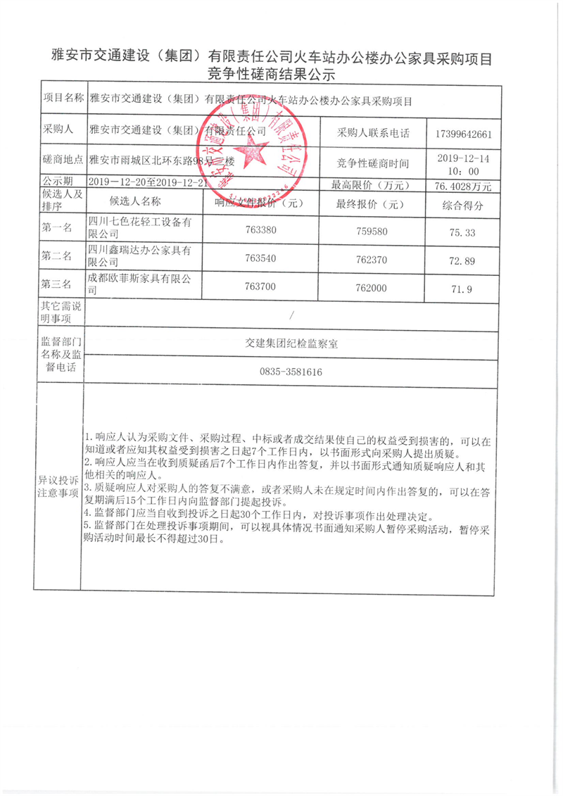雅安市交通建設(shè)(集團)有限責任公司火車站辦公樓辦公家具采購項目競爭性磋商結(jié)果公示