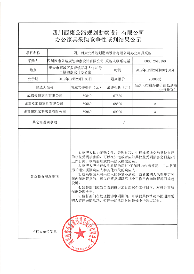 四川西康公路規(guī)劃勘察設(shè)計(jì)有限公司辦公家具采購競(jìng)爭(zhēng)性談判結(jié)果公示