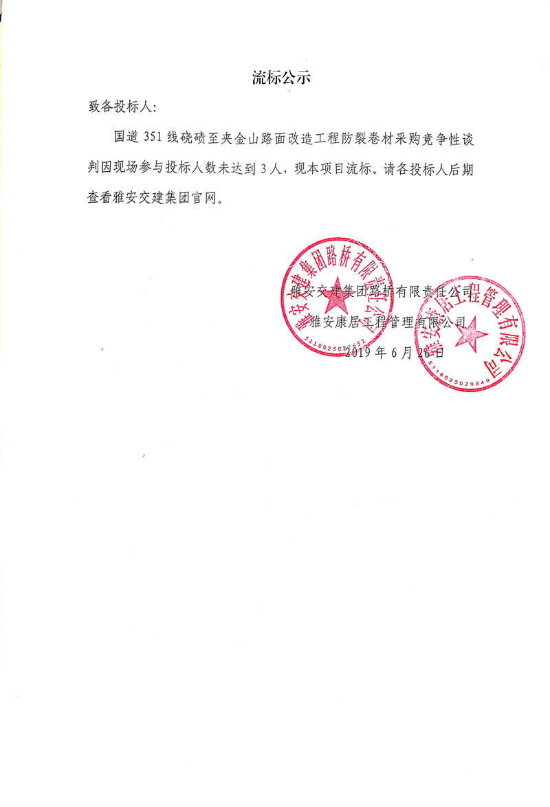 雅安交建集團路橋有限責任公司國道351線磽磧至夾金山路面改造工程防裂卷材采購競爭性談判流標公示