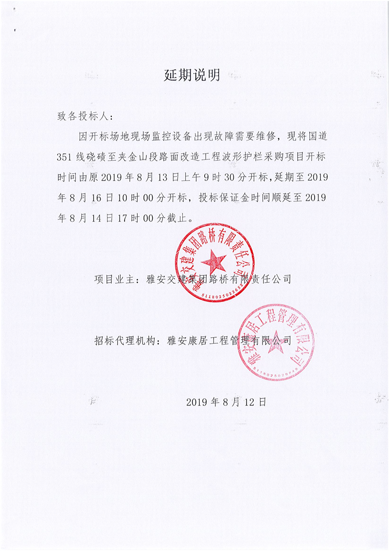 雅安交建集團(tuán)路橋有限責(zé)任公司國道351線磽磧至夾金山段路面改造工程波形護(hù)欄采購延期說明