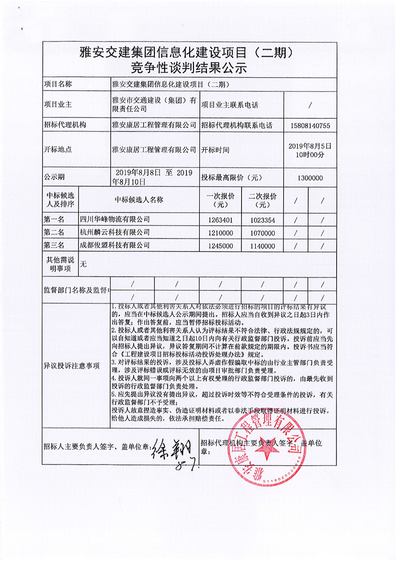 雅安交建集團信息化建設項目(二期)競爭性談判結(jié)果公示