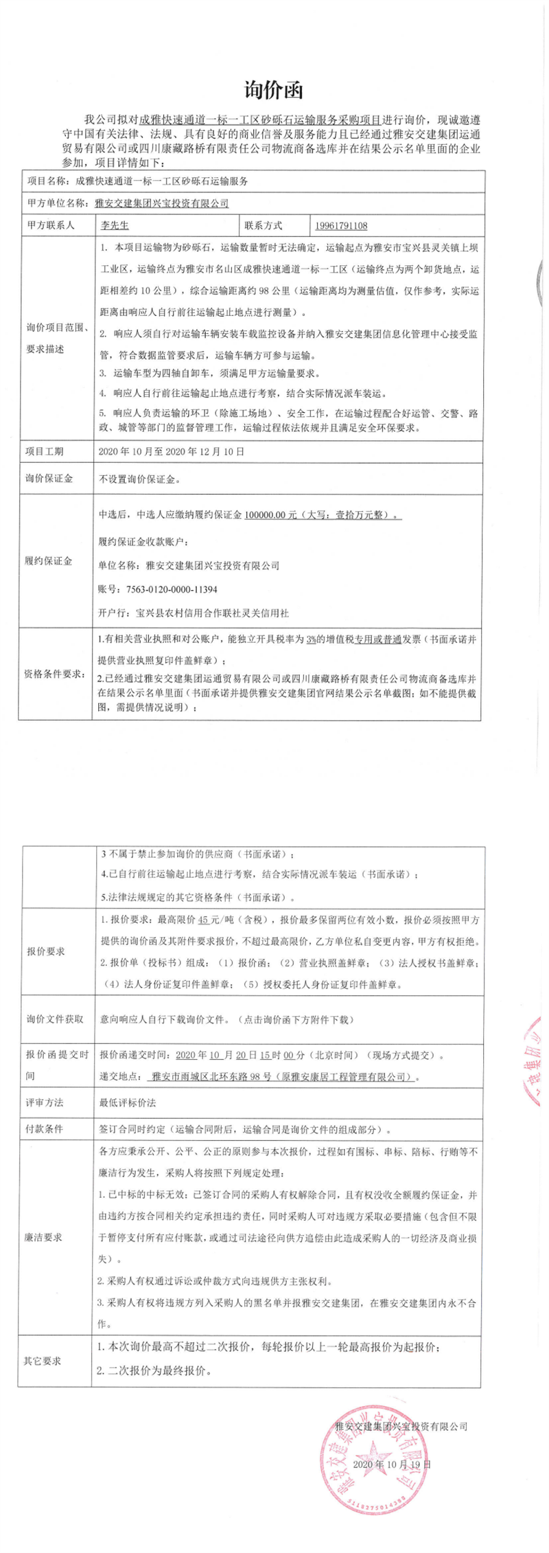 雅安交建集團(tuán)興寶投資有限公司成雅快速通道一標(biāo)一工區(qū)砂礫石運(yùn)輸服務(wù)采購(gòu)項(xiàng)目詢(xún)價(jià)函