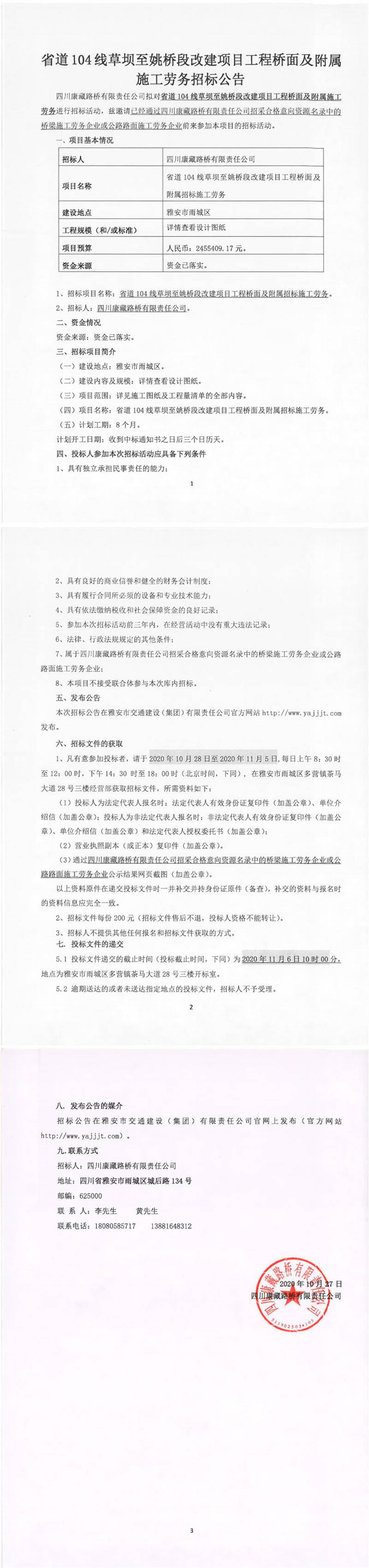 四川康藏路橋有限責任公司省道104線草壩至姚橋段改建項目工程橋面及附屬施工勞務(wù)招標公告