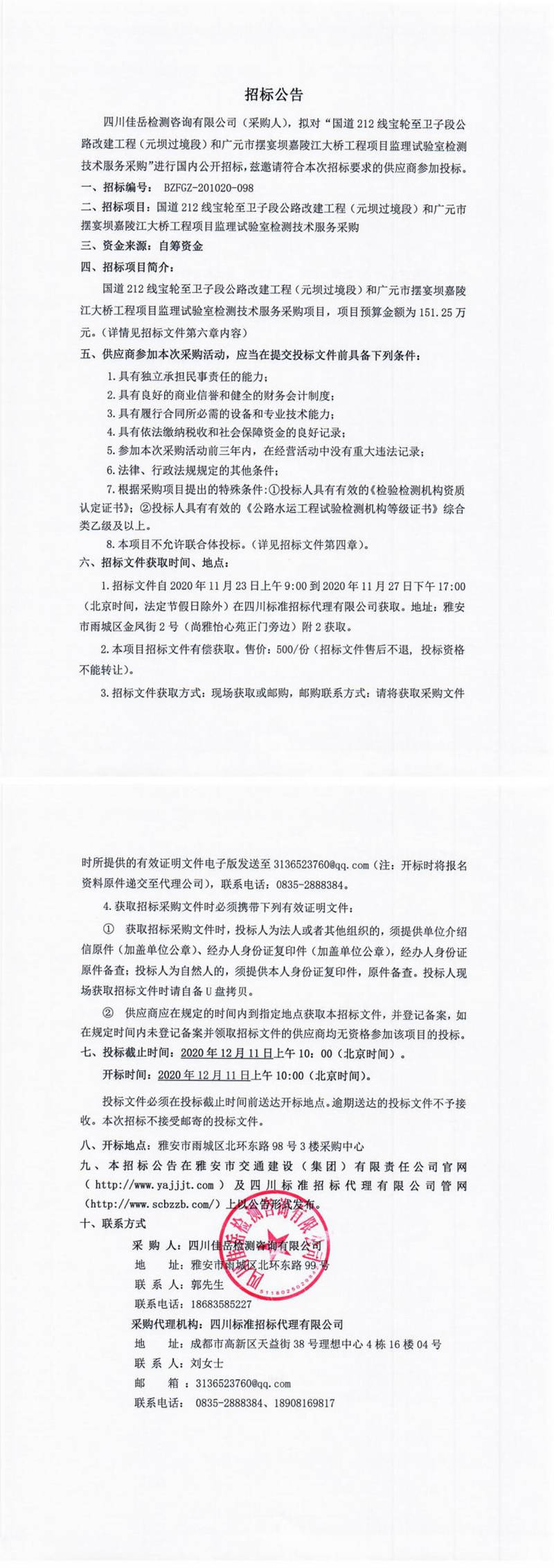 四川佳岳檢測咨詢有限公司國道212線寶輪至衛(wèi)子段公路改建工程(元壩過境段)和廣元市擺宴壩嘉陵江大橋工程項目監(jiān)理試驗室檢測技術(shù)服務采購招標公告