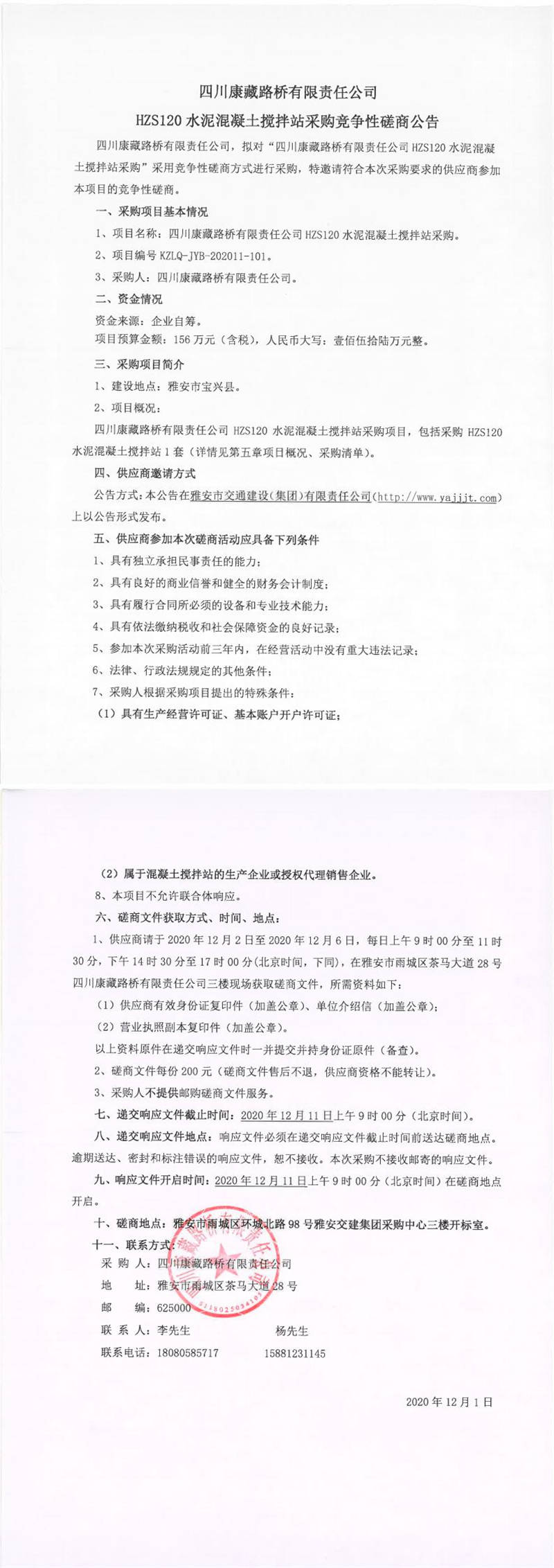 四川康藏路橋有限責(zé)任公司HZS120水泥混凝土攪拌站采購競(jìng)爭(zhēng)性磋商公告