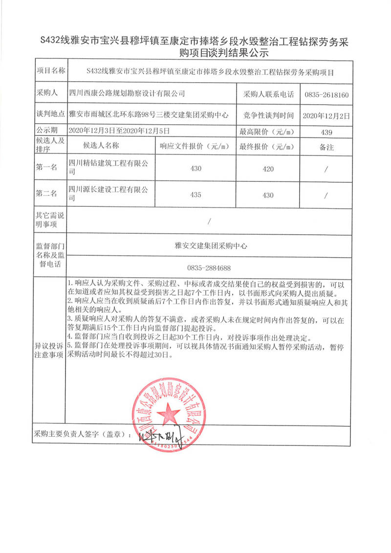四川西康公路規(guī)劃勘察設計有限公司S432線雅安市寶興縣穆坪鎮(zhèn)至康定市捧塔鄉(xiāng)段水毀整治工程鉆探勞務采購項目談判結(jié)果公示