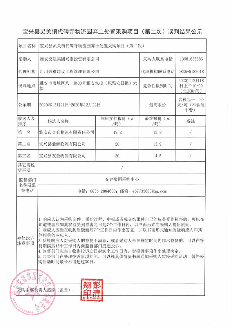 雅安交建集團(tuán)興寶投資有限公司寶興縣靈關(guān)鎮(zhèn)代碑寺物流園棄土處置采購(gòu)項(xiàng)目(第二次)談判結(jié)果公示