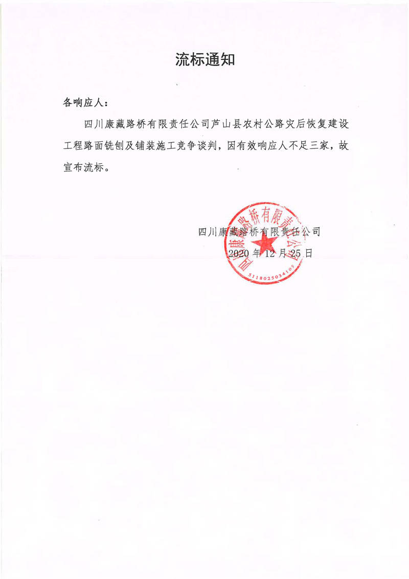 四川康藏路橋有限責任公司蘆山縣農(nóng)村公路災(zāi)后恢復(fù)建設(shè)工程路面銑刨及鋪裝施工流標通知