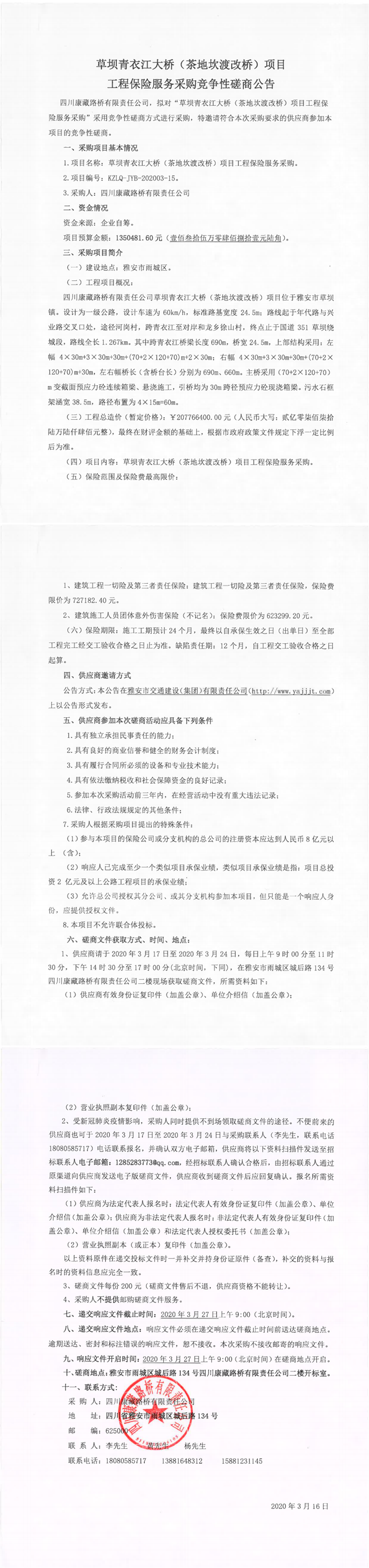 四川康藏路橋有限責任公司草壩青衣江大橋(茶地坎渡改橋)項目工程保險服務(wù)采購競爭性磋商公告