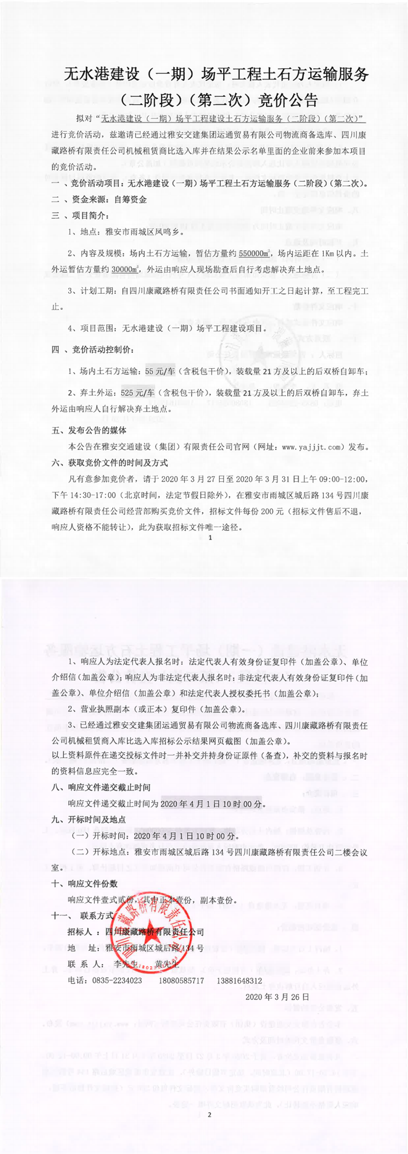 四川康藏路橋有限責(zé)任公司無水港建設(shè)(一期)場(chǎng)平工程建設(shè)土石方運(yùn)輸服務(wù)(二階段)(第二次)競價(jià)公告