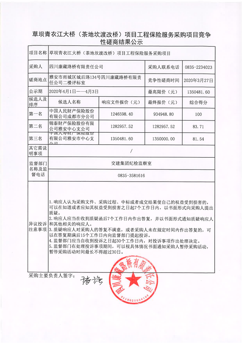 四川康藏路橋有限責任公司草壩青衣江大橋(茶地坎渡改橋)項目工程保險服務采購項目競爭性磋商結果公示