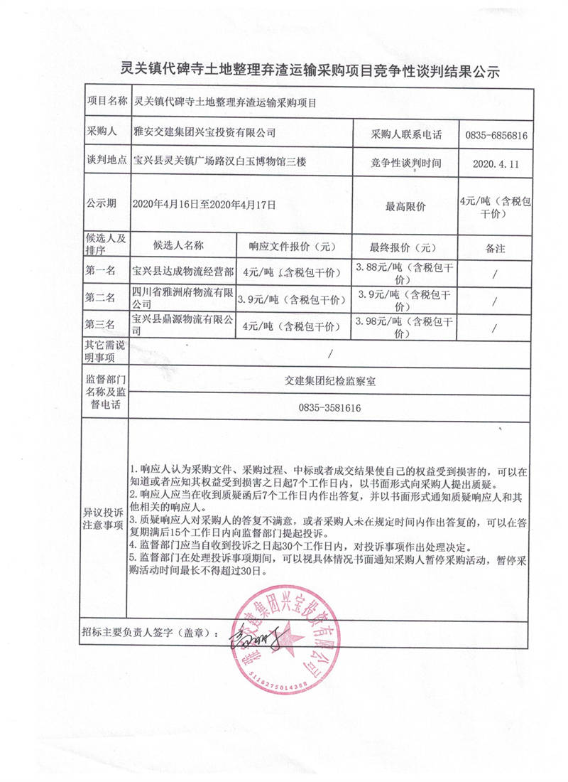 雅安交建集團興寶投資有限公司靈關(guān)鎮(zhèn)代碑寺土地整理棄渣運輸采購項目競爭性談判結(jié)果公示