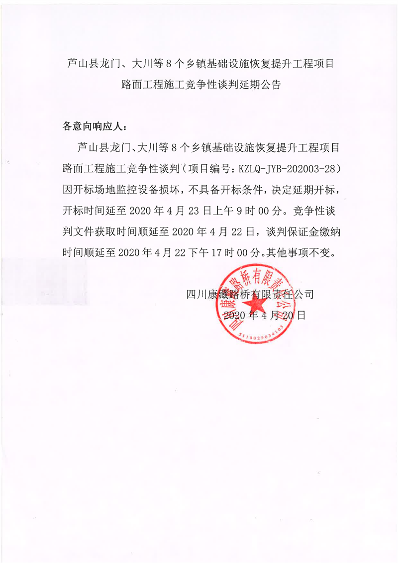 四川康藏路橋有限責(zé)任公司蘆山縣龍門、大川等8個(gè)鄉(xiāng)鎮(zhèn)基礎(chǔ)設(shè)施恢復(fù)提升工程項(xiàng)目路面工程施工競爭性談判延期公告
