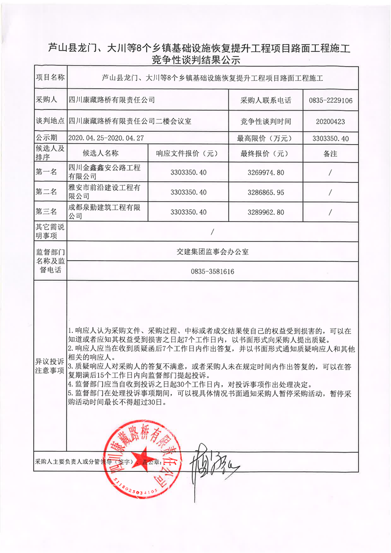 四川康藏路橋有限責(zé)任公司蘆山縣龍門、大川等8個鄉(xiāng)鎮(zhèn)基礎(chǔ)設(shè)施恢復(fù)提升工程項目路面工程施工競爭性談判結(jié)果公示