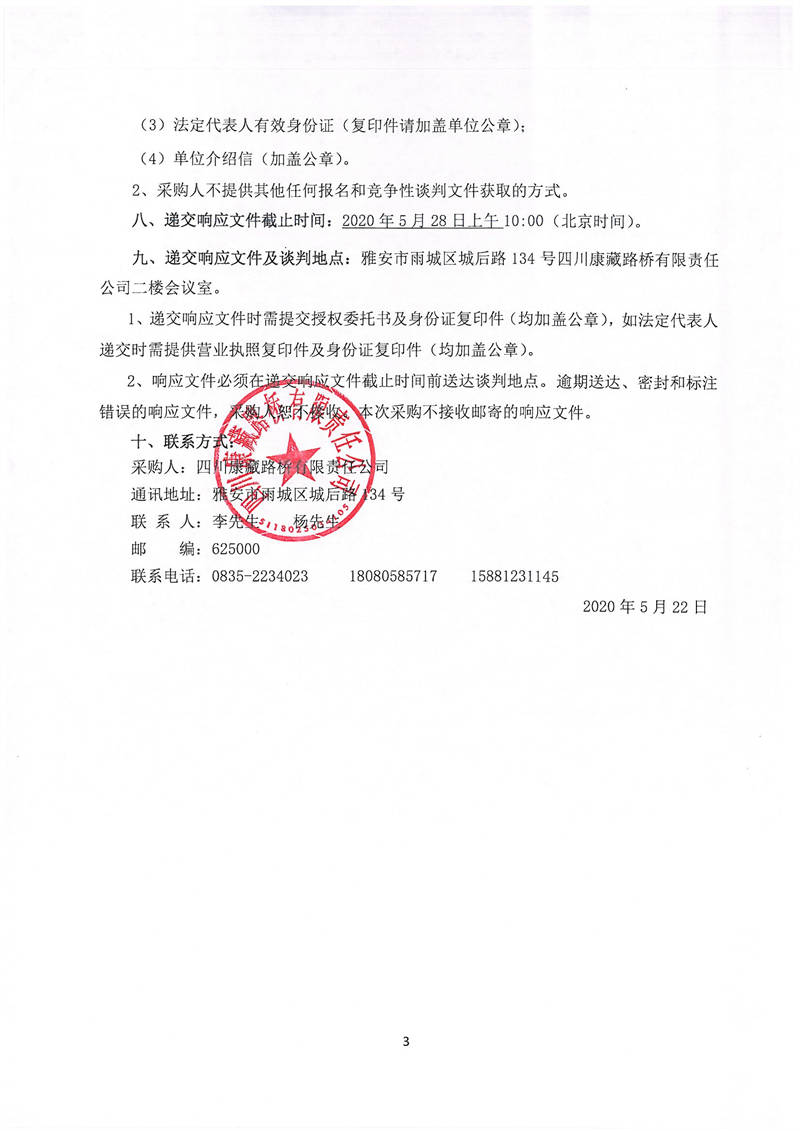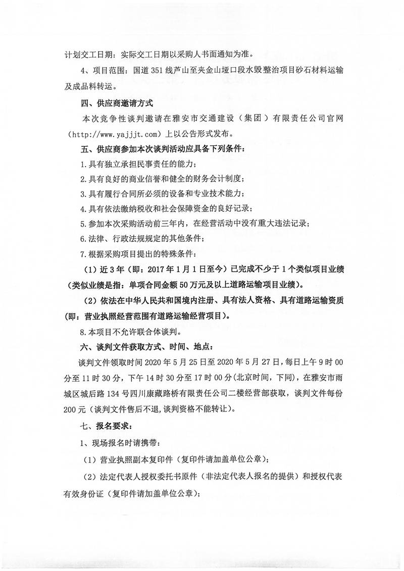 四川康藏路橋有限責(zé)任公司國道351線蘆山至夾金山埡口段8.22水毀項目砂石材料運(yùn)輸服務(wù)項目(第三次)談判公告