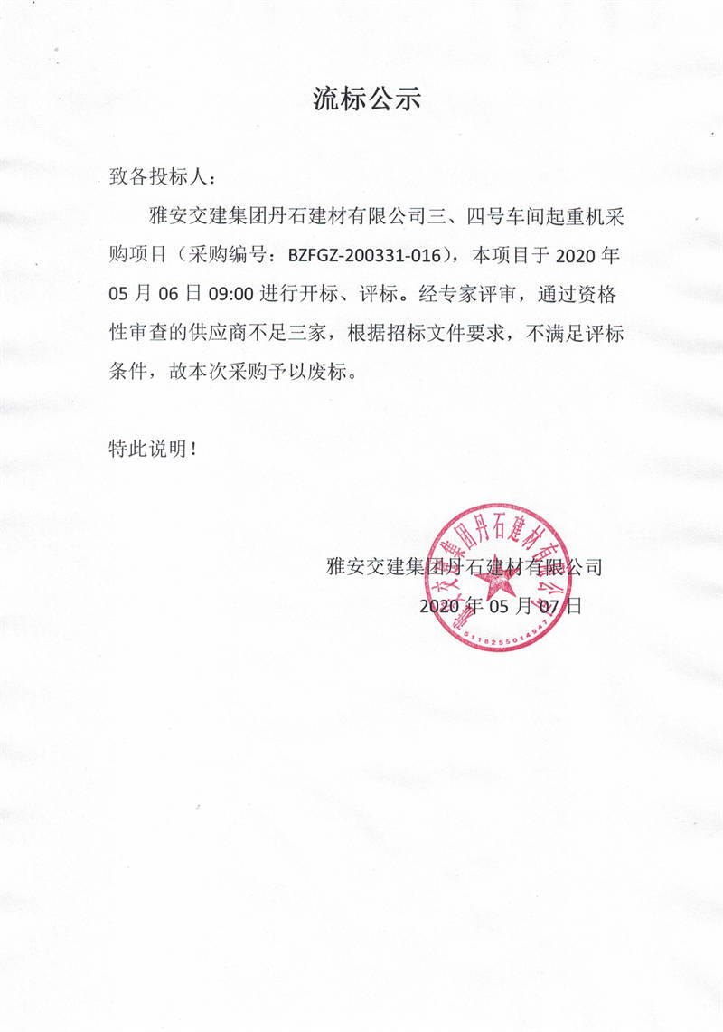 雅安交建集團(tuán)丹石建材有限公司三、四號車間起重機(jī)采購項(xiàng)目流標(biāo)公示