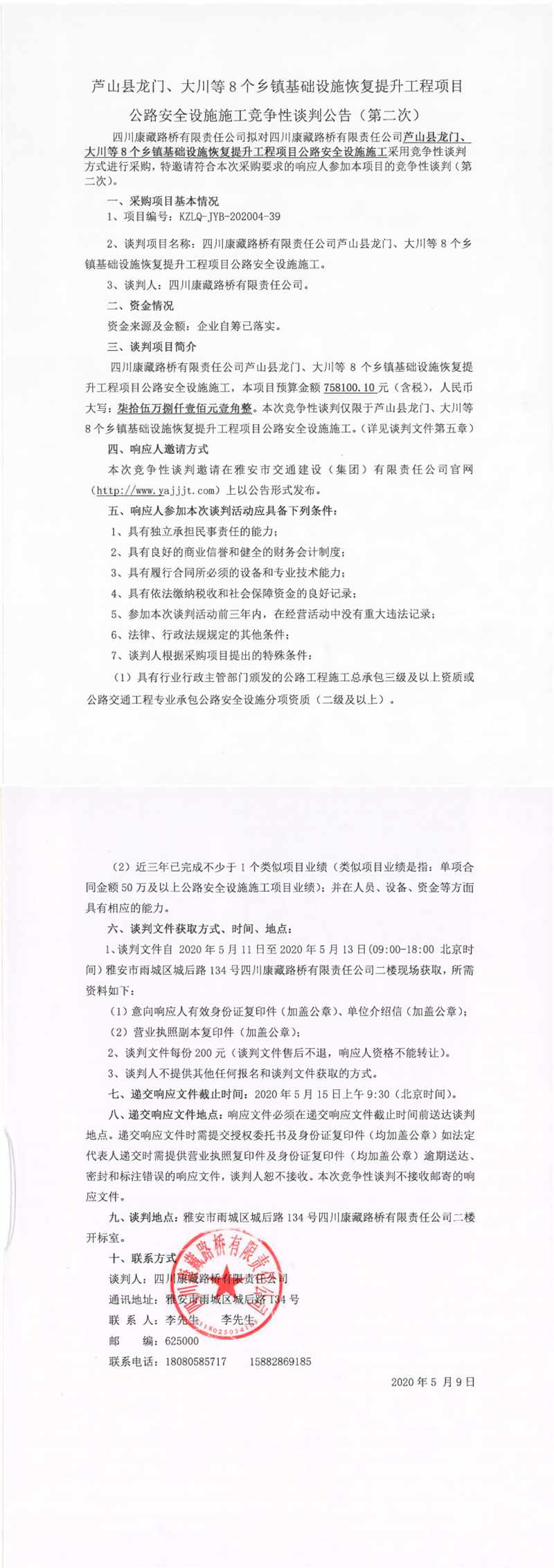 四川康藏路橋有限責(zé)任公司蘆山縣龍門、大川等8個(gè)鄉(xiāng)鎮(zhèn)基礎(chǔ)設(shè)施恢復(fù)提升工程項(xiàng)目公路安全設(shè)施施工競爭性談判公告(第二次)