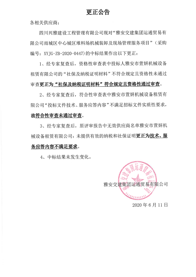 雅安交建集團(tuán)運(yùn)通貿(mào)易有限公司雨城區(qū)中心城區(qū)堆料場(chǎng)機(jī)械裝卸及現(xiàn)場(chǎng)管理服務(wù)項(xiàng)目更正公告