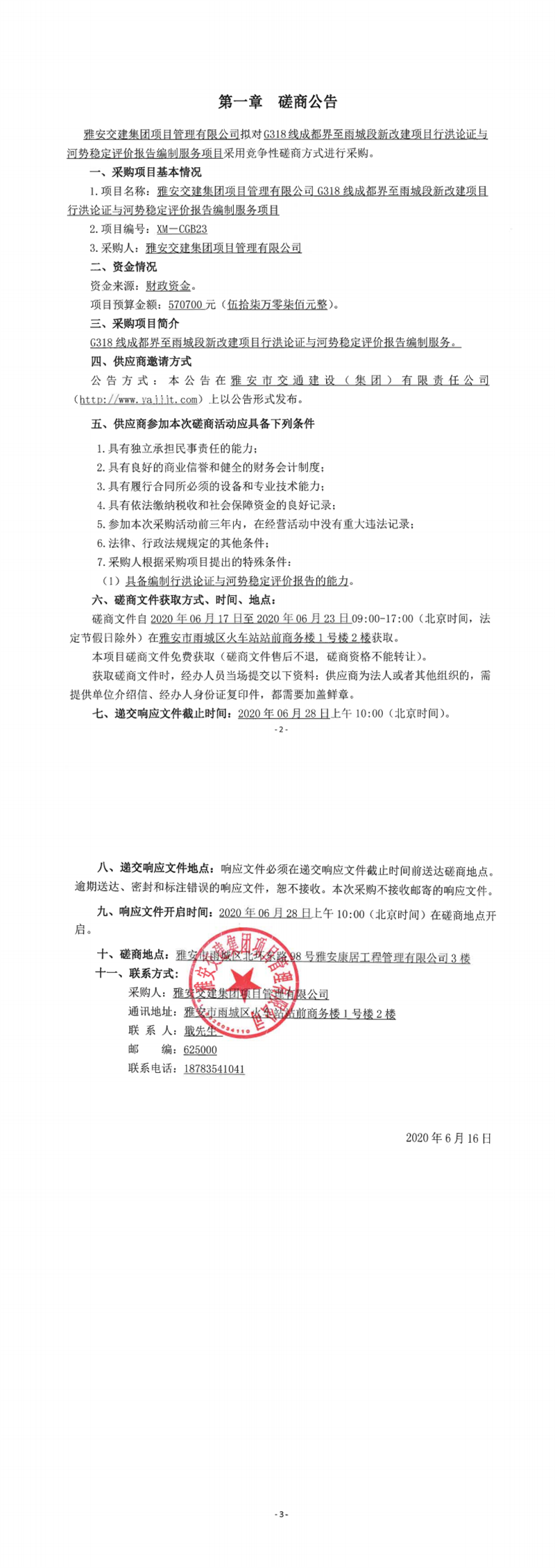 雅安交建集團(tuán)項(xiàng)目管理有限公司G318線成都界至雨城段新改建項(xiàng)目行洪論證與河勢穩(wěn)定評價報告編制服務(wù)項(xiàng)目競爭性磋商公告