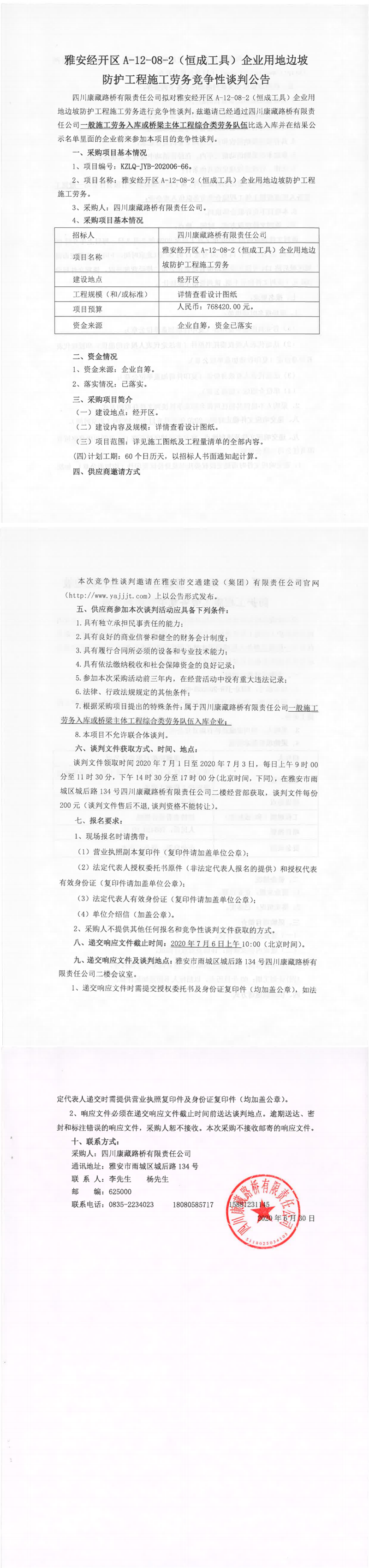 四川康藏路橋有限責任公司雅安經開區(qū)A-12-08-2(恒成工具)企業(yè)用地邊坡防護工程施工勞務競爭性談判公告