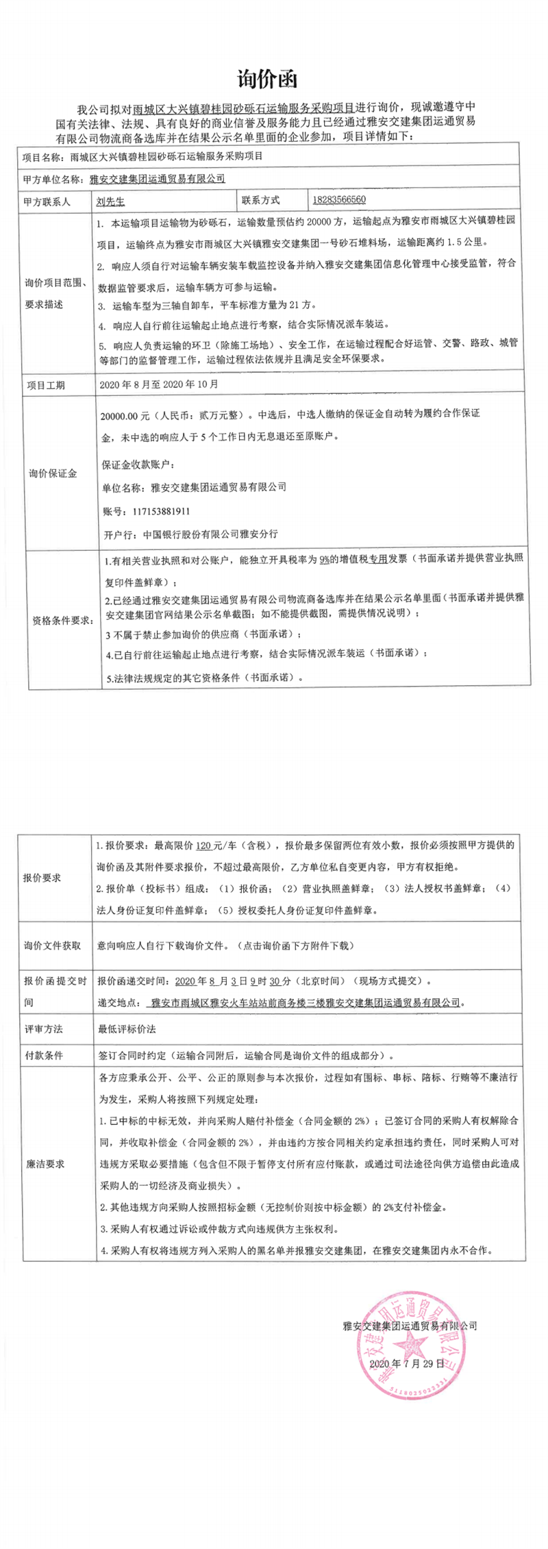 雅安交建集團(tuán)運(yùn)通貿(mào)易有限公司雨城區(qū)大興鎮(zhèn)碧桂園砂礫石運(yùn)輸服務(wù)采購項(xiàng)目(第二次)詢價(jià)函