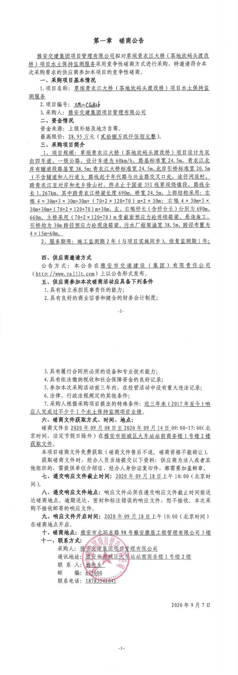 雅安交建集團項目管理有限公司草壩青衣江大橋(茶地坎碼頭渡改橋)項目水土保持監(jiān)測服務(wù)競爭性磋商公告