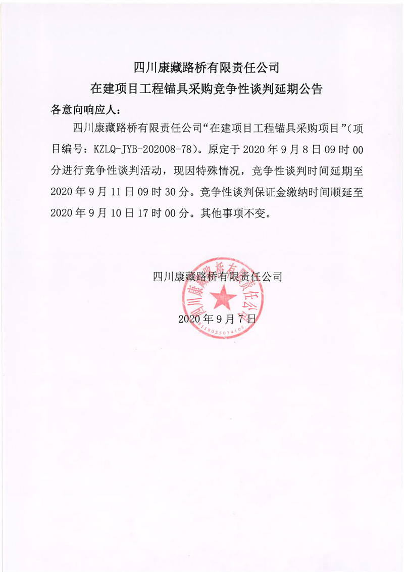 四川康藏路橋有限責(zé)任公司在建項(xiàng)目工程錨具采購競(jìng)爭(zhēng)性談判延期公告