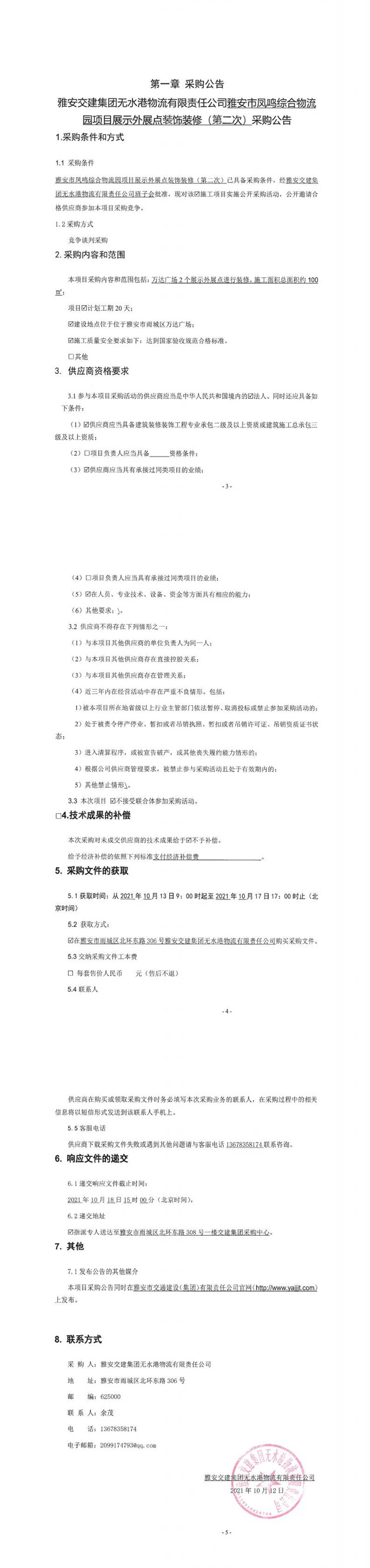 雅安交建集團(tuán)無(wú)水港物流有限責(zé)任公司雅安市鳳鳴綜合物流園項(xiàng)目展示外展點(diǎn)裝飾裝修(第二次)采購(gòu)公告