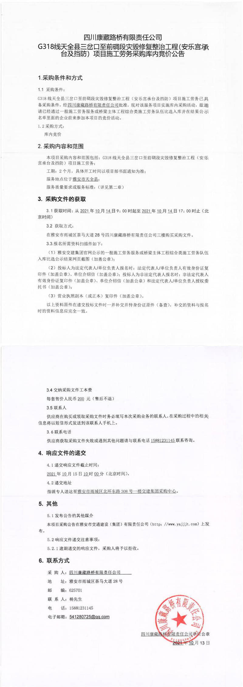 四川康藏路橋有限責(zé)任公司G318線天全縣三岔口至前碉段災(zāi)毀修復(fù)整治工程(安樂(lè)宮承臺(tái)及擋防)項(xiàng)目施工勞務(wù)采購(gòu)庫(kù)內(nèi)競(jìng)價(jià)公告