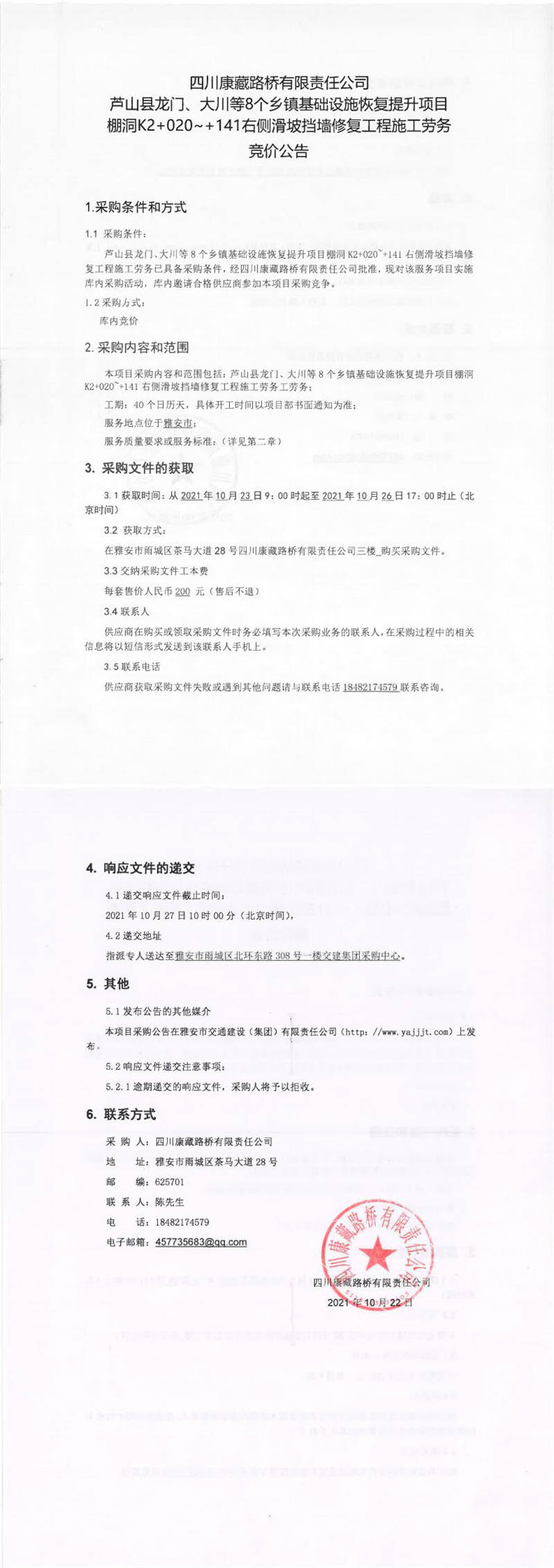 四川康藏路橋有限責(zé)任公司蘆山縣龍門、大川等8個(gè)鄉(xiāng)鎮(zhèn)基礎(chǔ)設(shè)施恢復(fù)提升項(xiàng)目棚洞K2+020~+141右側(cè)滑坡?lián)鯄π迯?fù)工程施工勞務(wù)采購(gòu)競(jìng)價(jià)公告