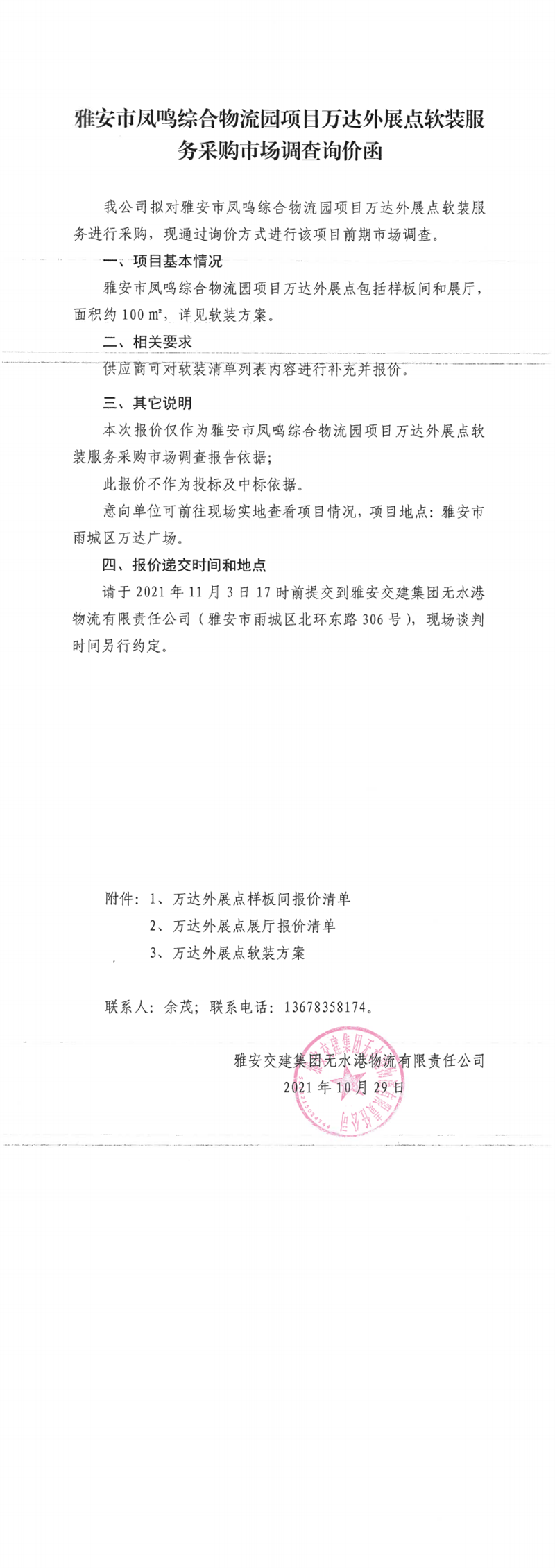 雅安交建集團(tuán)無水港物流有限責(zé)任公司雅安市鳳鳴綜合物流園項(xiàng)目萬達(dá)外展點(diǎn)軟裝服務(wù)采購市場(chǎng)調(diào)查詢價(jià)函