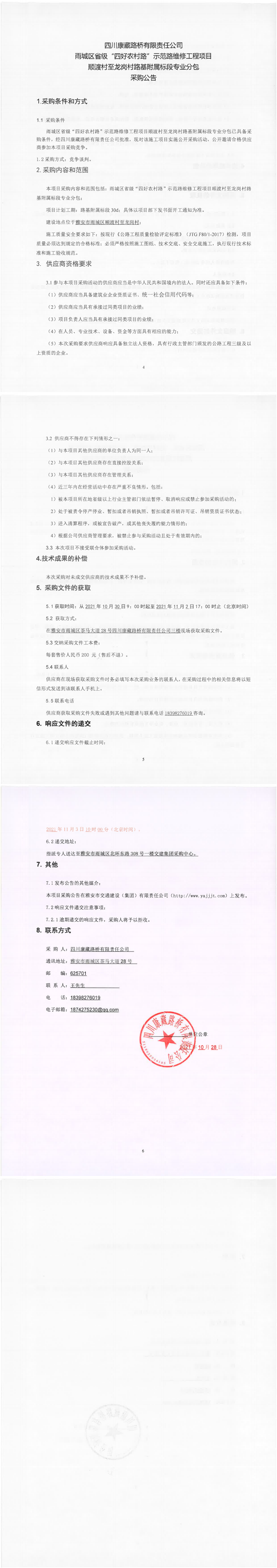 四川康藏路橋有限責(zé)任公司雨城區(qū)省級(jí)“四好農(nóng)村路”示范路維修工程項(xiàng)目順渡村至龍崗村路基附屬標(biāo)段專業(yè)分包采購(gòu)公告