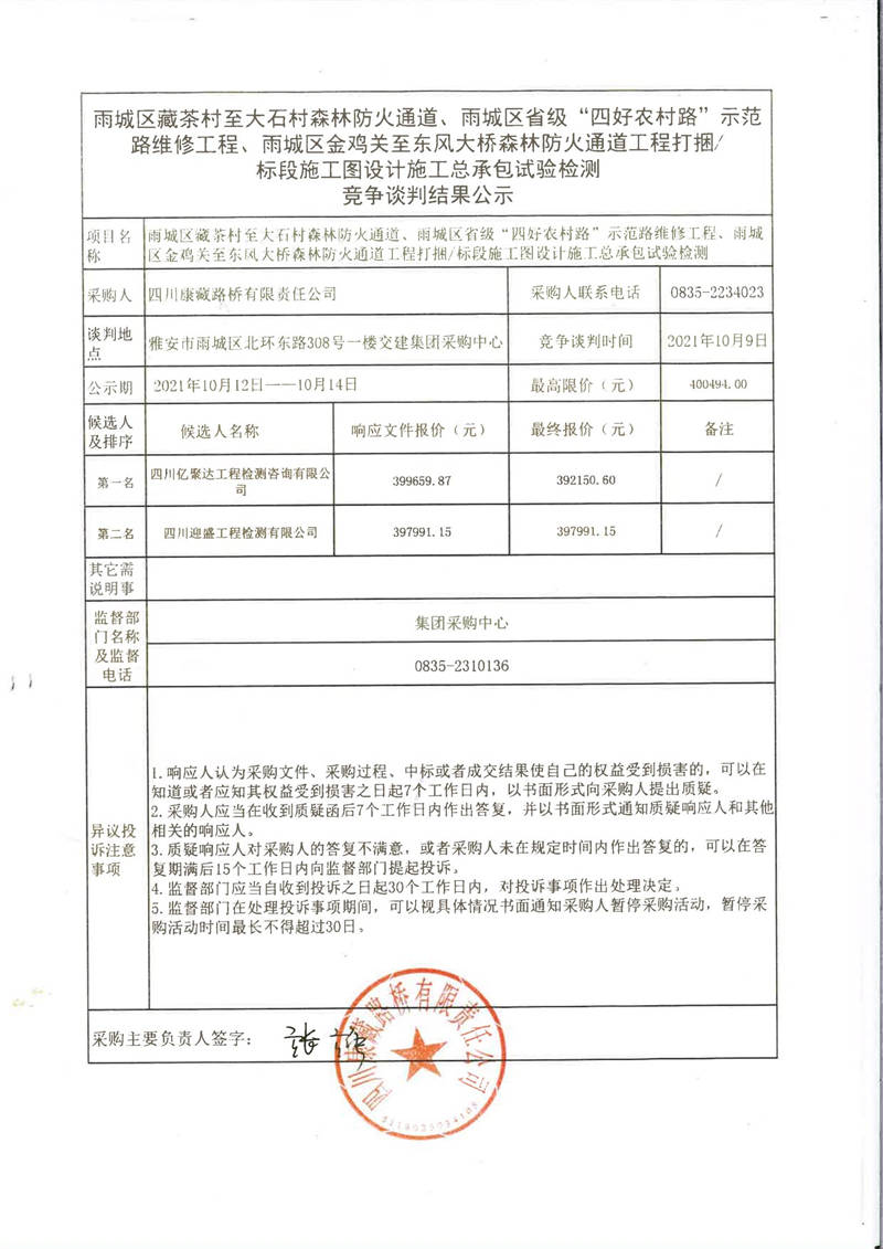 四川康藏路橋有限責任公司雨城區(qū)藏茶村至大石村森林防火通道、雨城區(qū)省級“四好農村路”示范路維修工程、雨城區(qū)金雞關至東風大橋森林防火通道工程打捆/標段施工圖設計施工總承包試驗檢測競爭談判結果公示