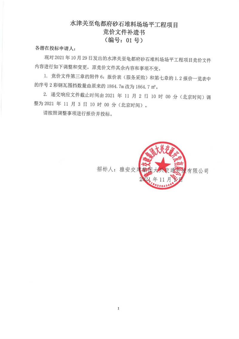 雅安交建集團(tuán)大興交通開(kāi)發(fā)有限公司水津關(guān)至龜都府砂石堆料場(chǎng)場(chǎng)平工程項(xiàng)目競(jìng)價(jià)文件補(bǔ)遺書(shū)(編號(hào):01號(hào))