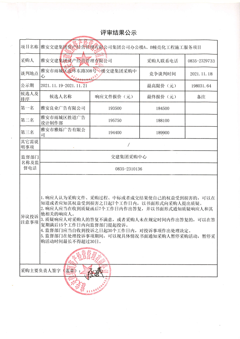 雅安交建集團(tuán)資產(chǎn)經(jīng)營管理有限公司集團(tuán)公司辦公樓A、B幢亮化工程施工服務(wù)項(xiàng)目評(píng)審結(jié)果公示