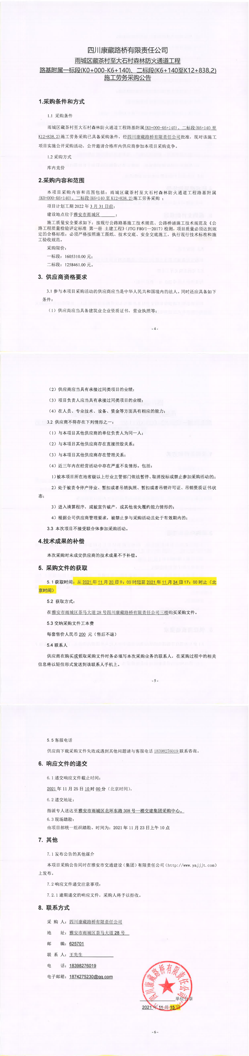 四川康藏路橋有限責(zé)任公司雨城區(qū)藏茶村至大石村森林防火通道工程路基附屬一標段(K0+000-K6+140)、二標段(K6+140至K12+838.2)施工勞務(wù)采購公告