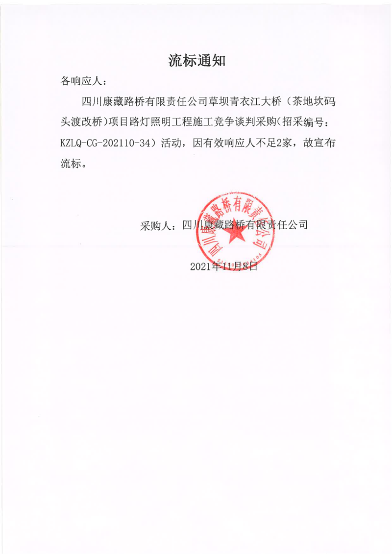 四川康藏路橋有限責(zé)任公司草壩青衣江大橋(茶地坎碼頭渡改橋)項目路燈照明工程施工流標(biāo)通知