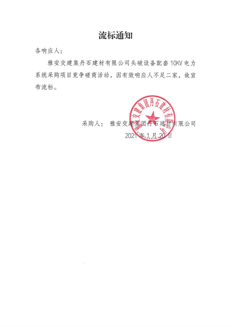 雅安交建集團(tuán)丹石建材有限公司頭破設(shè)備配套10KV電力系統(tǒng)采購項(xiàng)目流標(biāo)通知
