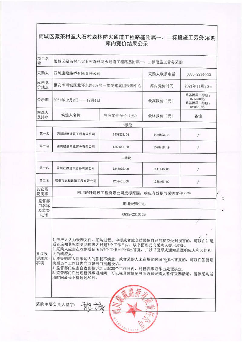 四川康藏路橋有限責(zé)任公司雨城區(qū)藏茶村至大石村森林防火通道工程路基附屬一、二標(biāo)段施工勞務(wù)采購(gòu)庫內(nèi)競(jìng)價(jià)結(jié)果公示