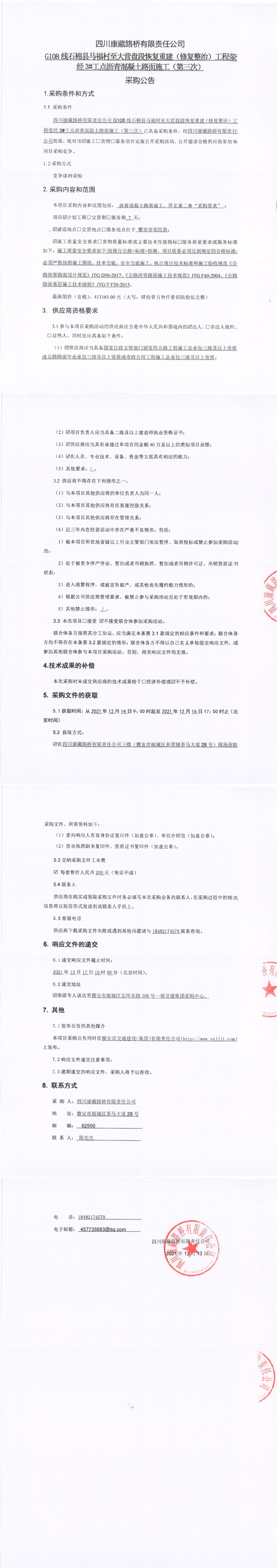 四川康藏路橋有限責(zé)任公司G108線石棉縣馬福村至大營(yíng)盤(pán)段恢復(fù)重建(修復(fù)整治)工程滎經(jīng)3#工點(diǎn)瀝青混凝土路面施工(第三次)采購(gòu)公告
